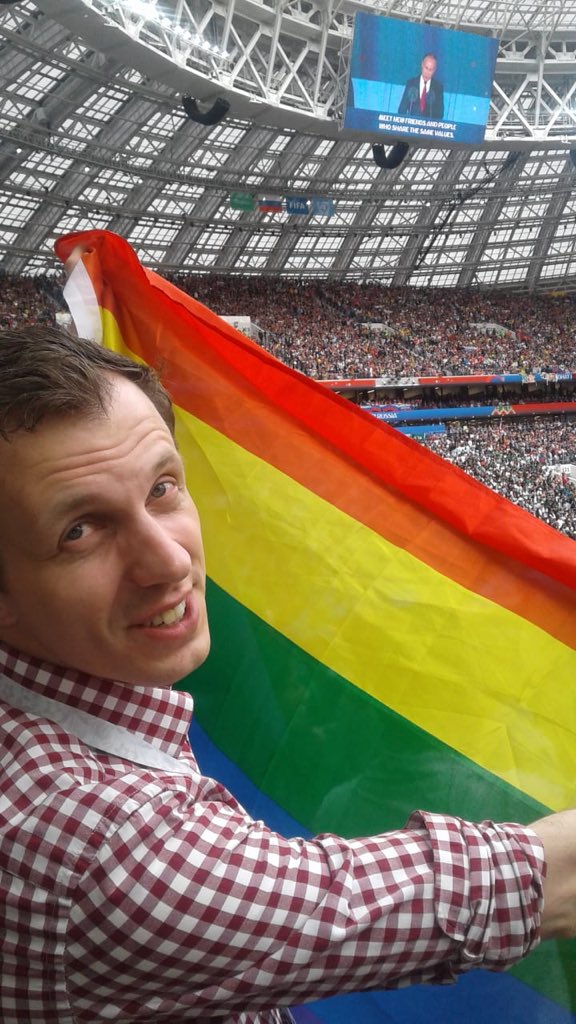 وقام أليكساندر أجابوف، رئيس الاتحاد الروسي للرياضيين المثليين، برفع علم «الرينبو» في مدرجات مباراة افتتاح كأس العالم بين روسيا والسعودية.