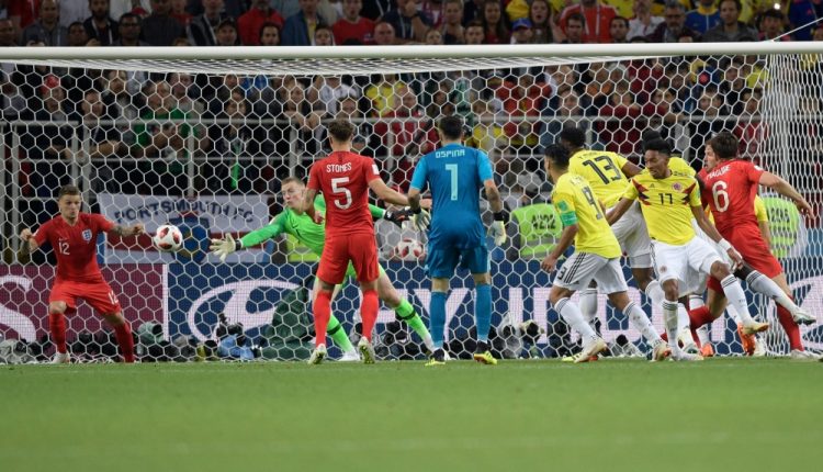 ياري مينا يحرز هدف كولومبيا في مرمى إنجلترا في الوقت القاتل - إنتهاء الوقت الأصلي للمباراة بالتعادل 1-1 ..واللجوء الى وقت إضافي أول بعد قليل