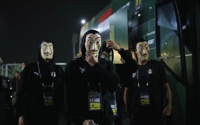 ونشر الحساب الرسمي للاتحاد الافريقي لكرة القدم، عبر موقع التواصل الاجتماعي «تويتر»، مقطع مصور لحظة وصول لاعبو المنتخب مرتدين أقنعة المسلسل الإسباني الشهير «لا كاسا دي بابل» عقب وصولهم ملعب المباراة.