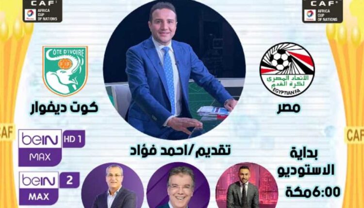 يقدم الإعلامي المصري أحمد فؤاد، الاستديو التحليلي لمباريات المنتخب المصري لكرة القدم على شاشة قنوات «بن سبورت»، والتي تقام في إطار منافسات بطولة كأس الأمم الإفريقية، إذ يخوض المنتخب المصري في السادسة مساء غدا الاربعاء المباراة الهامة والمصيرية أمام منتخب كوت ديفوار في دور الـ ١٦ لبطولة كأس الامم الافريقية بالكاميرا، وتنقلها على الهواء مباشرة قناة بن سبورت Max 1 ـ Max2، حيث تذاع المباراة مصحوبة بتعليق المعلق المصري الشهير على محمد على.
