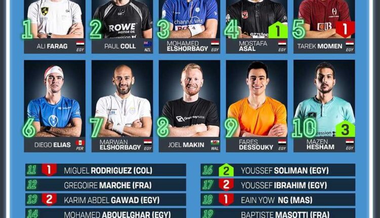 كما حافظ محمد الشوربجي على تواجده في المركز الثالث، فيما تبادل الثنائي المصري مصطفى عسل وطارق مؤمن المراكز بعدما ارتقى مصطفى عسل للمركز الرابع، فيما تراجع طارق مؤمن مركزًا ليأتي في المرتبة الخامسة، وحافظ مروان الشوربجي على تواجده في المركز السابع، وهو ما كرره فارس دسوقي باحتلاله المركز التاسع، فيما ارتقى مازن هشام 3 مراكز ليدخل قائمة أفضل 10 لاعبين باحتلاله المركز العاشر.