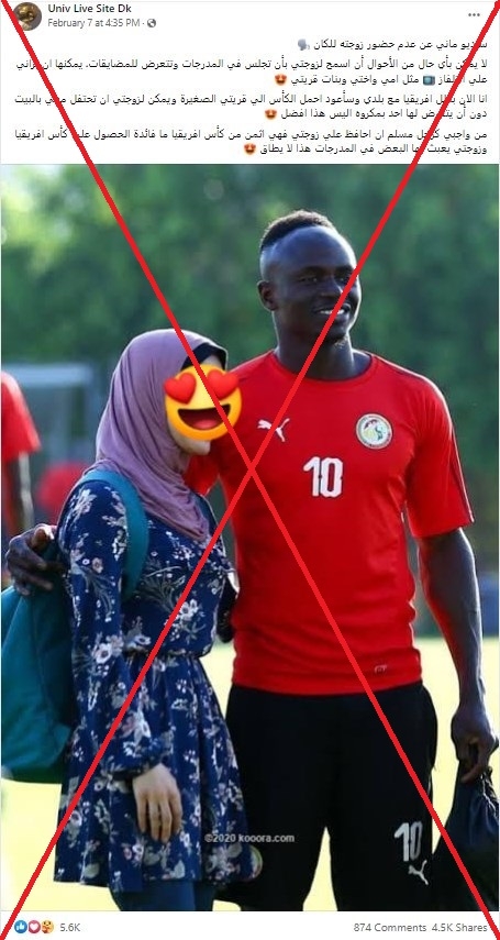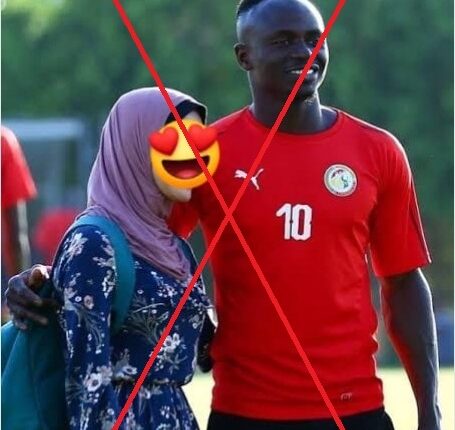 ويظهر في الصورة ساديو مانيه إلى جانب شابّة محجّبة، عمدت بعض الصفحات إلى إخفاء ملامح وجهها، وتعريفها بأنها زوجته.