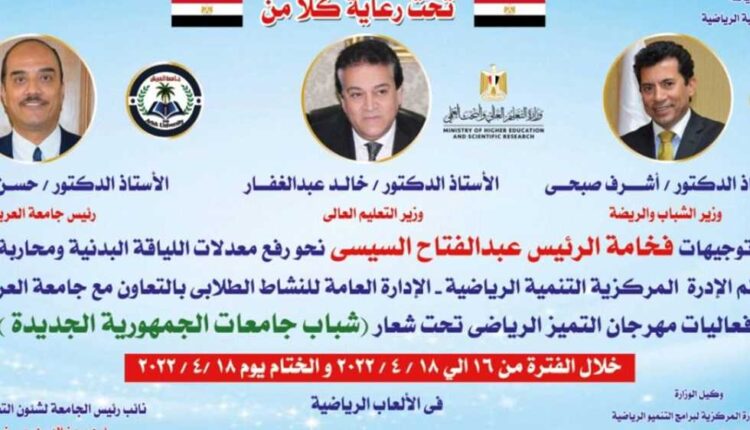 تزامنًا مع الاحتفالات بأعياد تحرير سيناء المجيدة تختتم وزارة الشباب والرياضة غدًا الاثنين فعاليات مهرجان التميز الرياضي من خلال الإدارة المركزية للتنمية الرياضية «الإدارة العامة للنشاط الرياضي الطلابي» بالتعاون مع الإدارة العامة لرعاية الشباب بجامعة العريش تحت شعار «شباب جامعات الجمهورية الجديدة».